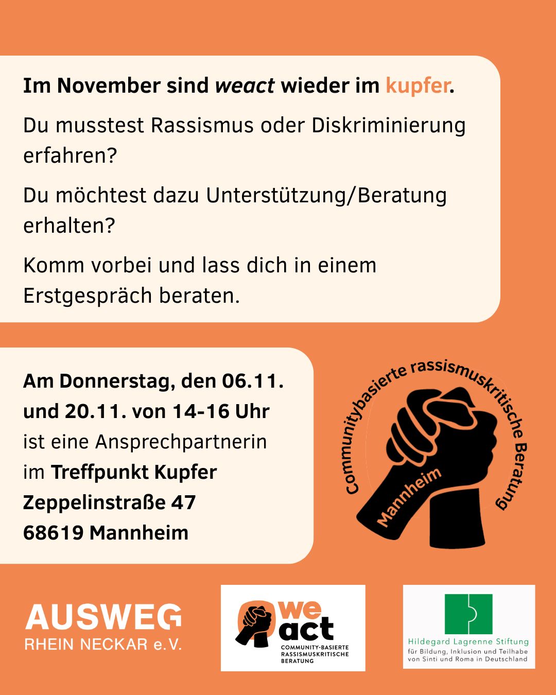 Jeden 1ten und 3ten Donnerstag im Monat bietet weact Mannheim von 14-16 Uhr eine offene Sprechstunde in den Räumlichkeiten von Ausweg e.V. an. Ausweg e.V. ist ein Verein, der sich gegen klassistische Diskriminierung einsetzt und Personen zu Anliegen wie Jobcenter, Wohnung, berät und beim Ausfüllen von Formularen unterstützt. Klassistische und rassistische Diskriminierung sind tief verwurzelte […]